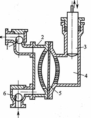 1-排出閥;2-泵體;3-柱塞;4-液缸;5-隔膜;6-吸入閥。